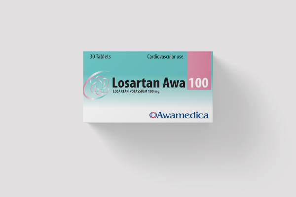 Each film-coated tablet contains Losartan Potassium BP 100 mg. Each carton contains 3 blister packs of 10 white, oval, film-coated tablets each with ‘Awa’ (Awamedica monogram) on one side and a break line on the other side.